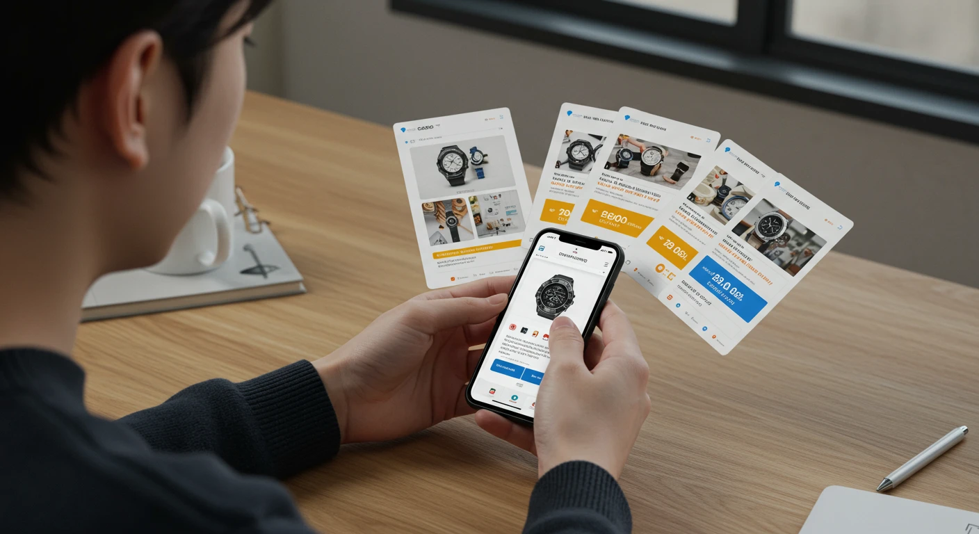 다양한 온라인 쇼핑몰에서 카시오 시계 할인 정보를 비교하는 모습