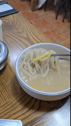 출렁다리에서 차로 10분 거리에 있는 이곳은 옛날 경양식 돈가스와 함께 제공되는 콩가루 칼국수가 특징입니다. 12,000원이라는 합리적인 가격에 칼국수 무한리필까지 제공되어 인기가 높습니다.