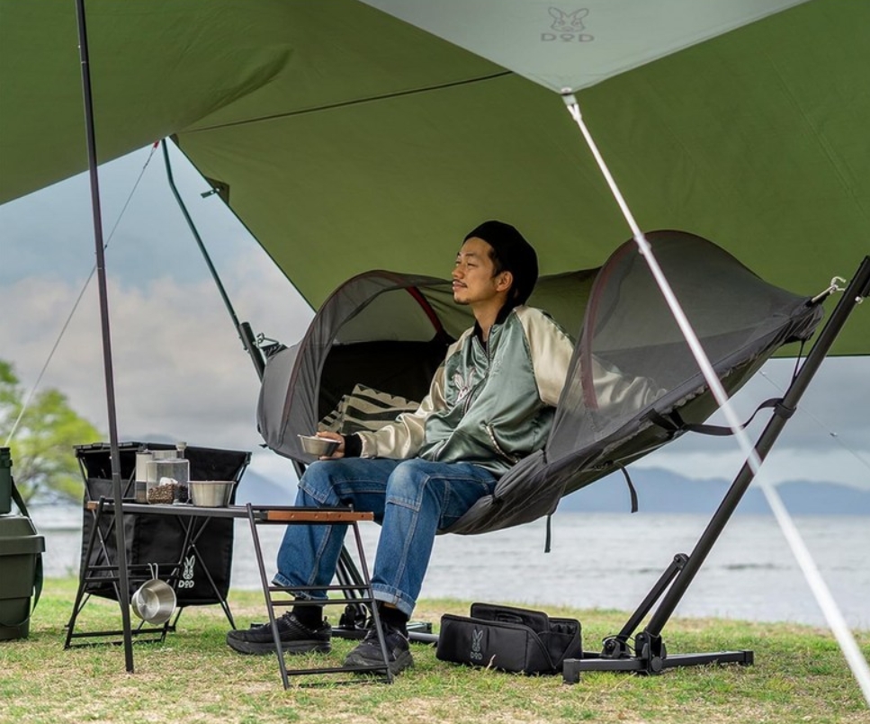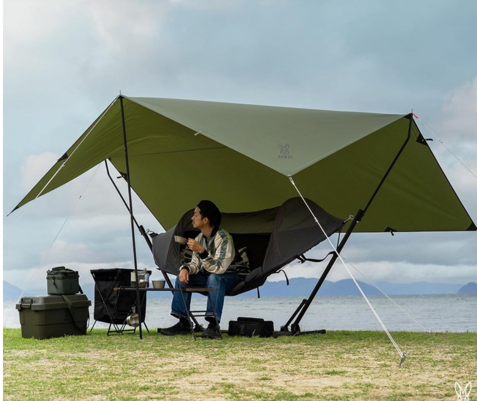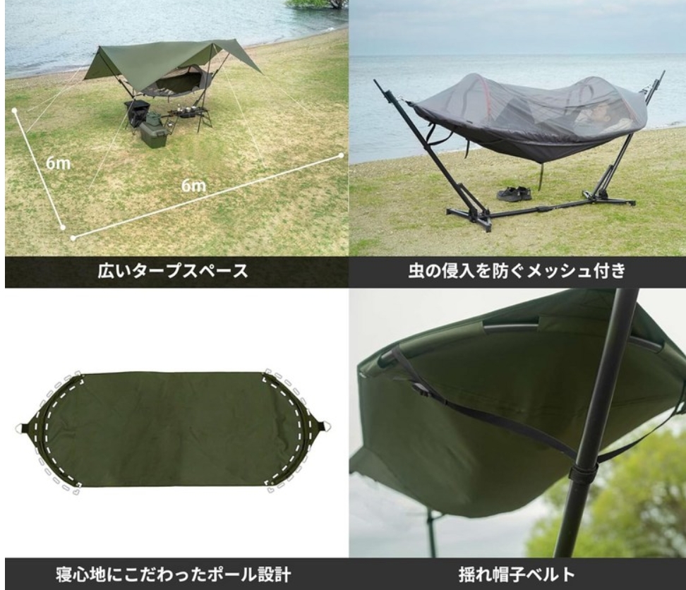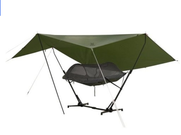타프가 함께 구성되어 있어 햇빛과 비를 효과적으로 차단하며, 해먹 위에는 메쉬 이너 텐트가 장착되어 여름철 벌레 걱정 없이 쾌적한 휴식을 즐길 수 있습니다.